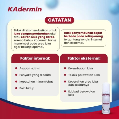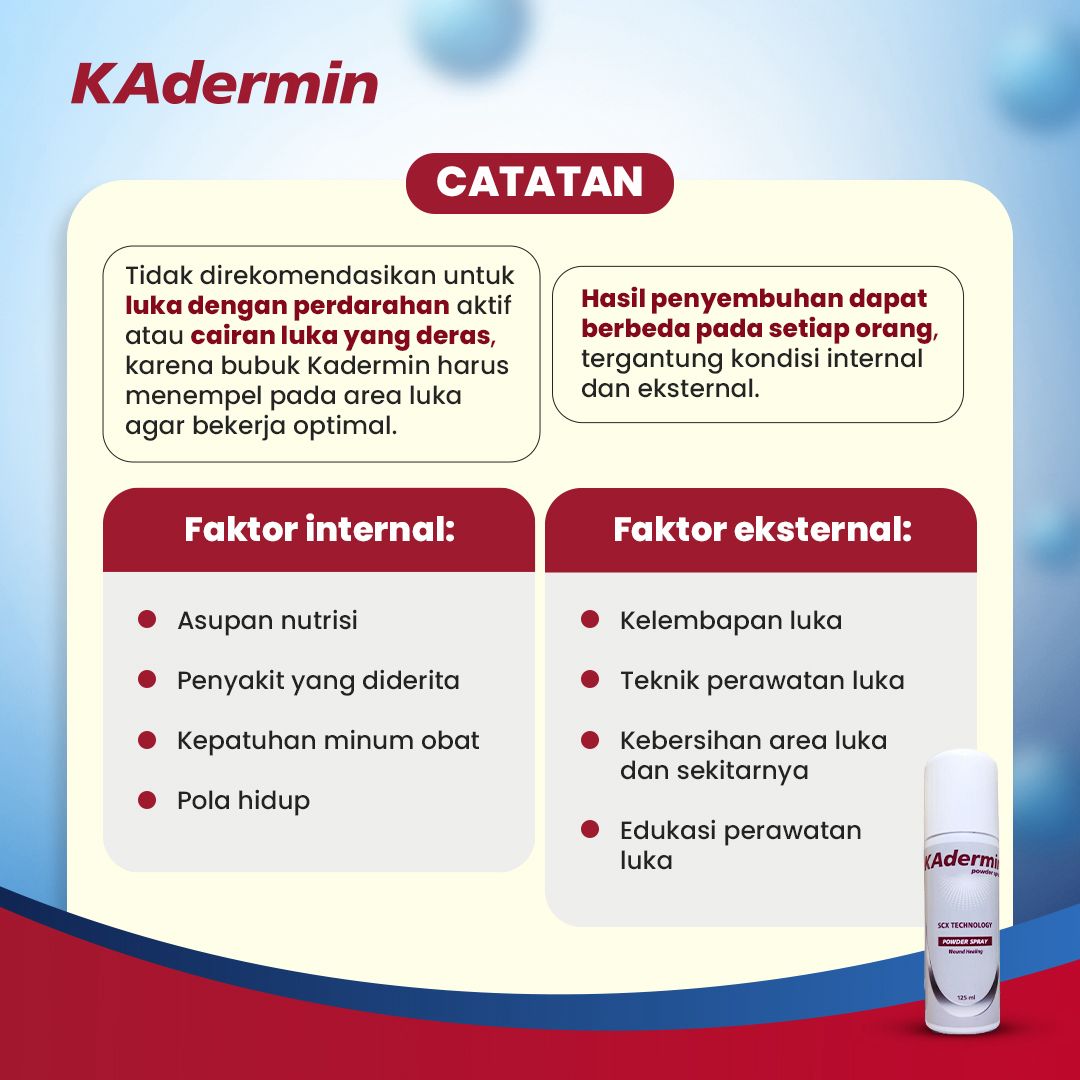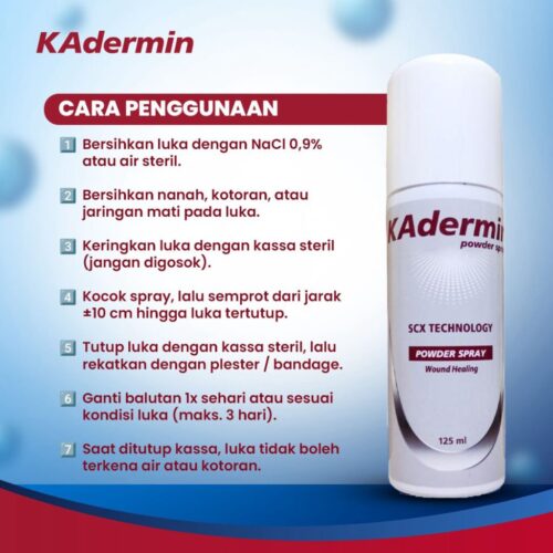 Untuk membantu mengatasi berbagai masalah tersebut, Kadermin Powder Spray dari Kadermin Indonesia hadir sebagai solusi praktis dalam perawatan luka. Dengan bentuk spray yang higienis dan mudah digunakan, Kadermin membantu melindungi luka dari risiko infeksi, menjaga area luka tetap kering, serta membantu proses penyembuhan luka dengan lebih optimal.